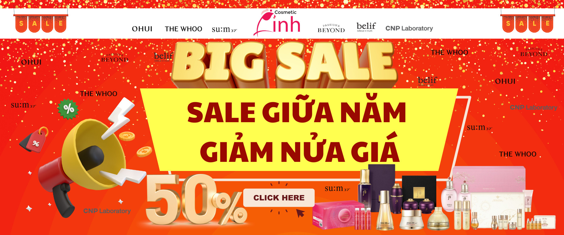 Cùng Linh Cosmetics săn siêu sale giữa năm với mức ưu đãi "khủng" lên đến 50% cho nhiều sản phẩm làm đẹp, chăm sóc da, trang điểm, thực phẩm bảo vệ sức khoẻ CHÍNH HÃNG 100%.